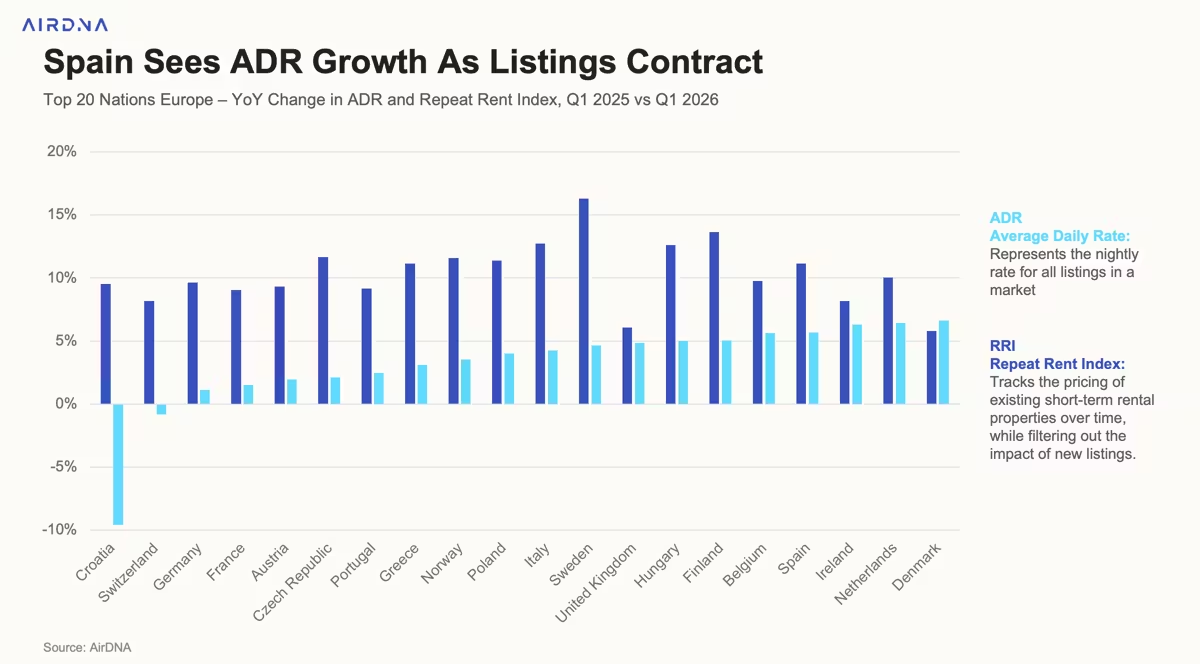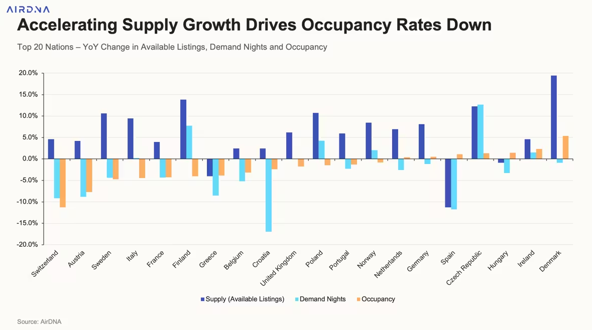Σύμφωνα με τα τελευταία στοιχεία της AirDNA, τον Μάρτιο του 2026 οι διαθέσιμες καταχωρίσεις στη χώρα μειώθηκαν κατά 4% σε ετήσια βάση, υποχωρώντας από 101.223 σε 97.186, σε αντίθεση με την υπόλοιπη Ευρώπη όπου η προσφορά αυξάνεται σταθερά.