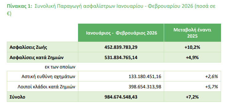 Σύμφωνα με τα στοιχεία της έρευνας της ΕΑΕΕ, η συνολική παραγωγή ασφαλίστρων την περίοδο Ιανουαρίου – Φεβρουαρίου 2026 ανήλθε στα 984,7 εκατ. ευρώ, καταγράφοντας αύξηση 7,2% σε σύγκριση με το αντίστοιχο διάστημα.