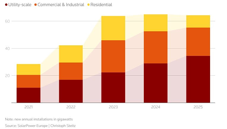 Η αύξηση που προκάλεσε ο πόλεμος έρχεται μετά την επιβράδυνση του ρυθμού των νέων ευρωπαϊκών ηλιακών εγκαταστάσεων το 2025, σύμφωνα με την ομάδα πίεσης του κλάδου SolarPower Europe, με την αδύναμη ζήτηση από οικιακούς πελάτες να αποτελεί βασικό παράγοντα μετά τη σταδιακή κατάργηση των προγραμμάτων στήριξης.
