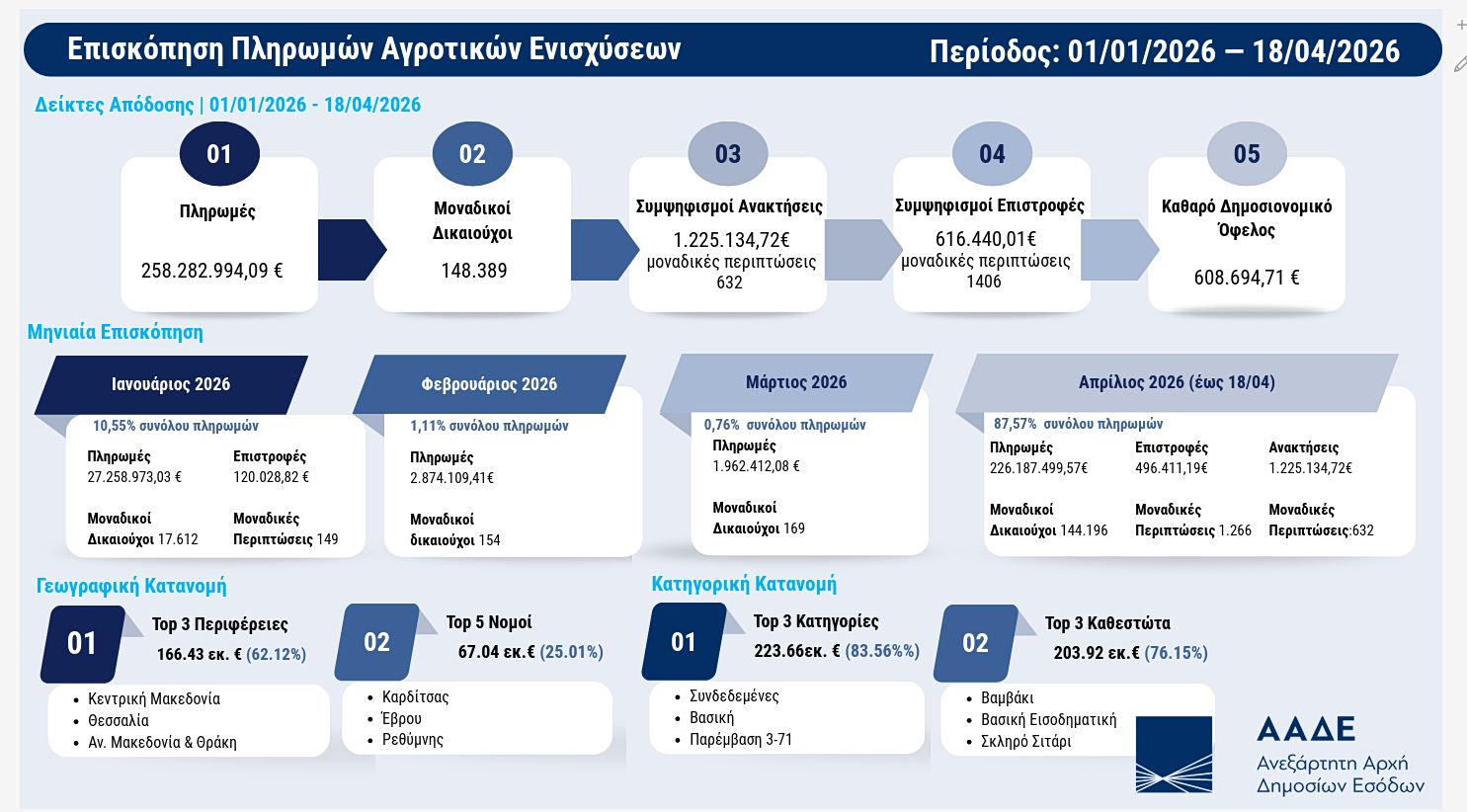 Συνολικά 228,8 εκατ. ευρώ κατέβαλε η ΑΑΔΕ την περίοδο 01/01/2026 έως 18/04/2026 σε 148.389 μοναδικούς δικαιούχους αγροτικών ενισχύσεων. Μέσω των συμψηφισμών, η ΑΑΔΕ ανέκτησε περίπου 1,2 εκατ. ευρώ από οφειλέτες, επιστρέφοντας παράλληλα περίπου 616 χιλ. ευρώ σε δικαιούχους.