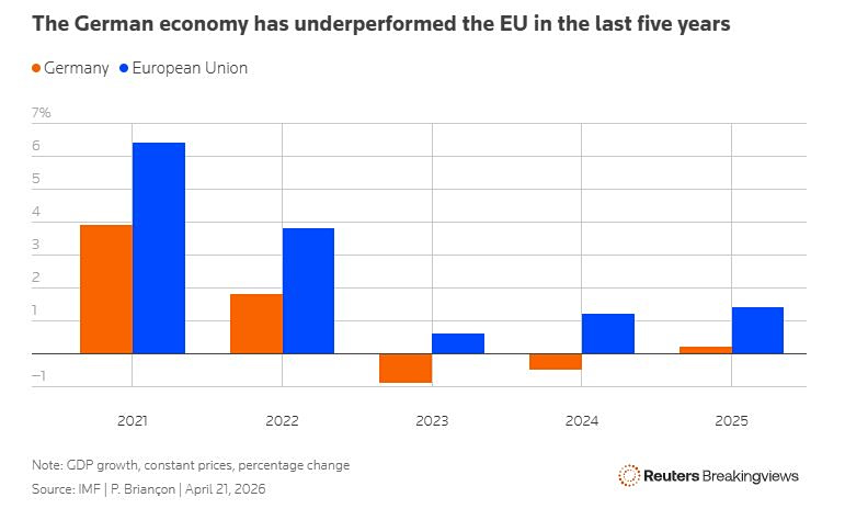 Ο ενεργειακός κλονισμός που προκάλεσαν οι βομβαρδισμοί του Ιράν από τις ΗΠΑ και το Ισραήλ πλήττει σοβαρά τη Γερμανία, όμως δεν αποτελεί καν το χειρότερο οικονομικό πρόβλημα της χώρας. Μετά από έξι χρόνια στάσιμης ανάπτυξης, η οικονομία θα ανακάμψει ελάχιστα φέτος και το επόμενο έτος, παρά το πρόγραμμα δημοσιονομικών κινήτρων ύψους 500 δισεκατομμυρίων ευρώ της κυβέρνησης. Χωρίς σοβαρές μεταρρυθμίσεις, τις οποίες το Βερολίνο φαίνεται ανίκανο ή απρόθυμο να εφαρμόσει, η χώρα φαίνεται καταδικασμένη σε μακροχρόνια στασιμότητα.