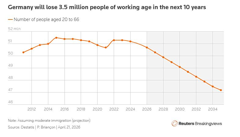 Κατ’ αρχάς, ο πληθυσμός σε ηλικία εργασίας συρρικνώνεται. Από 51 εκατομμύρια το 2024, ο αριθμός των ατόμων ηλικίας 20 έως 66 ετών θα μειωθεί σε 41 εκατομμύρια το 2070, υπό την προϋπόθεση μέτριας μετανάστευσης, σύμφωνα με την εθνική στατιστική υπηρεσία Destatis.