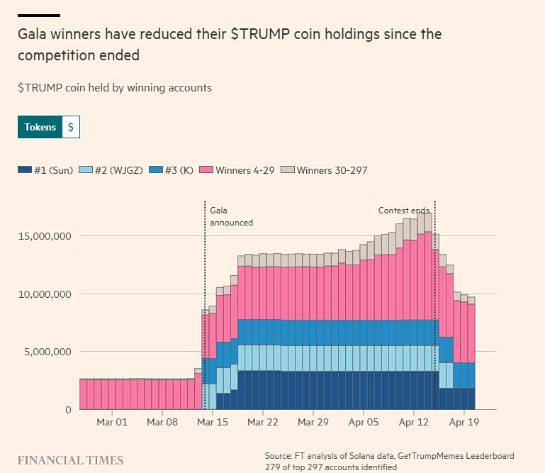Η ανάλυση των FT δείχνει ότι οι νικητές του VIP εισιτηρίου κατείχαν μια μέση αξία 539.000 δολαρίων $TRUMP, ή περίπου 191.000 νομισμάτων, στο τέλος του διαγωνισμού.