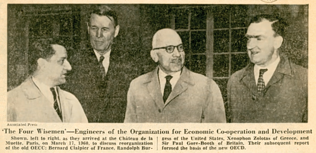 Είναι δύσκολο να γνωρίζουμε τι είναι πιο εντυπωσιακό: ο ρόλος του ως διευθυντή της Τράπεζας της Ελλάδος ή το γεγονός ότι το 1960 ήταν μέλος μιας επιτροπής που ονομάστηκε «οι Τέσσερις Σοφοί» και συγκλήθηκε από τον Οργανισμό Ευρωπαϊκής Οικονομικής Συνεργασίας (OEEC) για την προώθηση της καλύτερης συνεργασίας και της οικονομικής ανάπτυξης. Οι διάσημοι τέσσερις ήταν: ο Μπερνάρ Κλαλπιέ από τη Γαλλία, ο Ράντολφ Μπέρτζες από την Αμερική, ο Σερ Πολ Γκορ-Μπουθ από την Αγγλία και ο Ξενοφών Ζολώτας από την Ελλάδα.