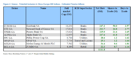 Υπενθυμίζεται εδώ ότι σύμφωνα με την ομάδα Global Markets Strategy της JP Morgan, η ένταξη των ελληνικών μετοχών στους δείκτες STOXX –και ειδικότερα στους STOXX Europe 600 και Euro Stoxx– αναμένεται να ενεργοποιήσει παθητικές εισροές ύψους περίπου 962,7 εκατ. δολαρίων. Πρόκειται για κεφάλαια που κινούνται μηχανικά, βάσει κανόνων δεικτών, ανεξάρτητα από επενδυτικό sentiment ή διακριτικές αποφάσεις.