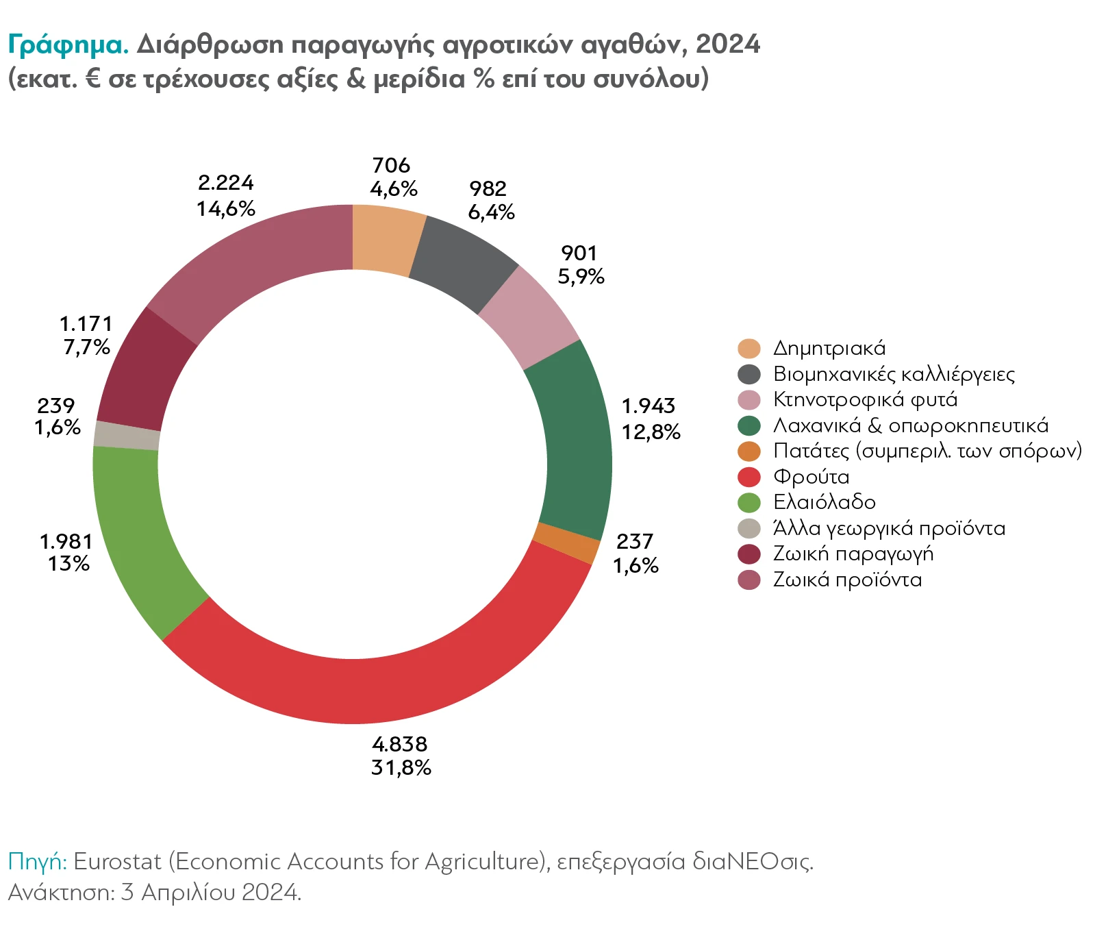 Το 2024 η συνολική αξία της ελληνικής αγροτικής παραγωγής έφτασε σχεδόν τα 15,7 δισ. ευρώ