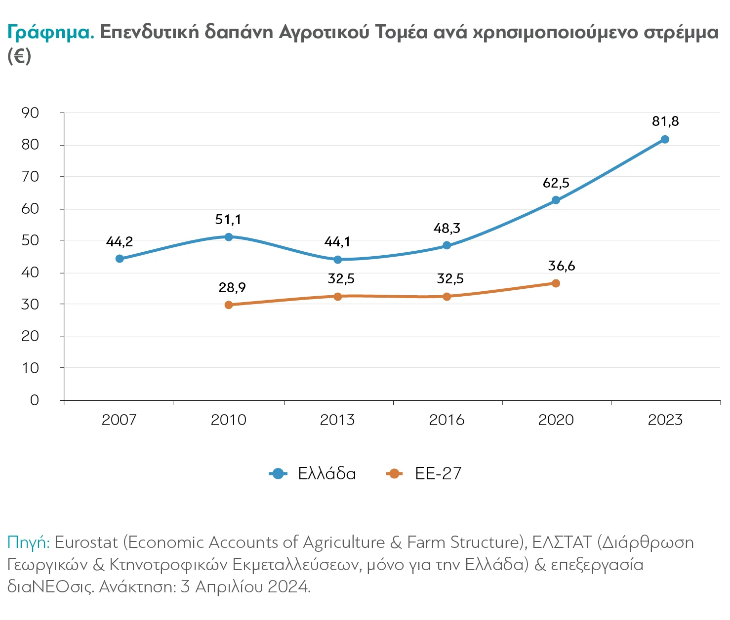 Επιπλέον, υπάρχει ένα στοιχείο που αρχικά φαίνεται παράδοξο. Οι επενδύσεις του ελληνικού ΑΤ (επενδυτική δαπάνη ανά χρησιμοποιούμενο στρέμμα) παραμένουν διαχρονικά υψηλότερες από τον μέσο όρο της ΕΕ. Αυτό, όμως, δεν σημαίνει ότι ο Τομέας επενδύει πιο σωστά ή πιο αποτελεσματικά: ο μεγάλος κατακερματισμός της ελληνικής αγροτικής γης σε πολλές μικρές εκμεταλλεύσεις, όπως φάνηκε και παραπάνω, αυξάνει «τεχνητά» την ανάγκη για εξοπλισμό. Πολλοί μικροί παραγωγοί αγοράζουν ξεχωριστά μηχανήματα για τις μικρές εκτάσεις τους και ξοδεύουν συνολικά περισσότερα, χωρίς αυτό να σημαίνει μεγαλύτερη παραγωγικότητα. Αντίθετα, οι παραγωγοί διαθέτουν συχνά τα χρήματά τους σε φθηνό βασικό εξοπλισμό, πολλές φορές μεταχειρισμένο, αντί για φυτικό ή ζωικό κεφάλαιο, ή για πιο σύγχρονα (και πιο ακριβά) μηχανήματα ή συμπληρωματικό εξοπλισμό που θα βελτίωνε ουσιαστικά την παραγωγή. Επιπρόσθετα, το νέο κεφάλαιο εξυπηρετεί μικρές εκτάσεις και όχι μεγαλύτερες, πιο οργανωμένες μονάδες.