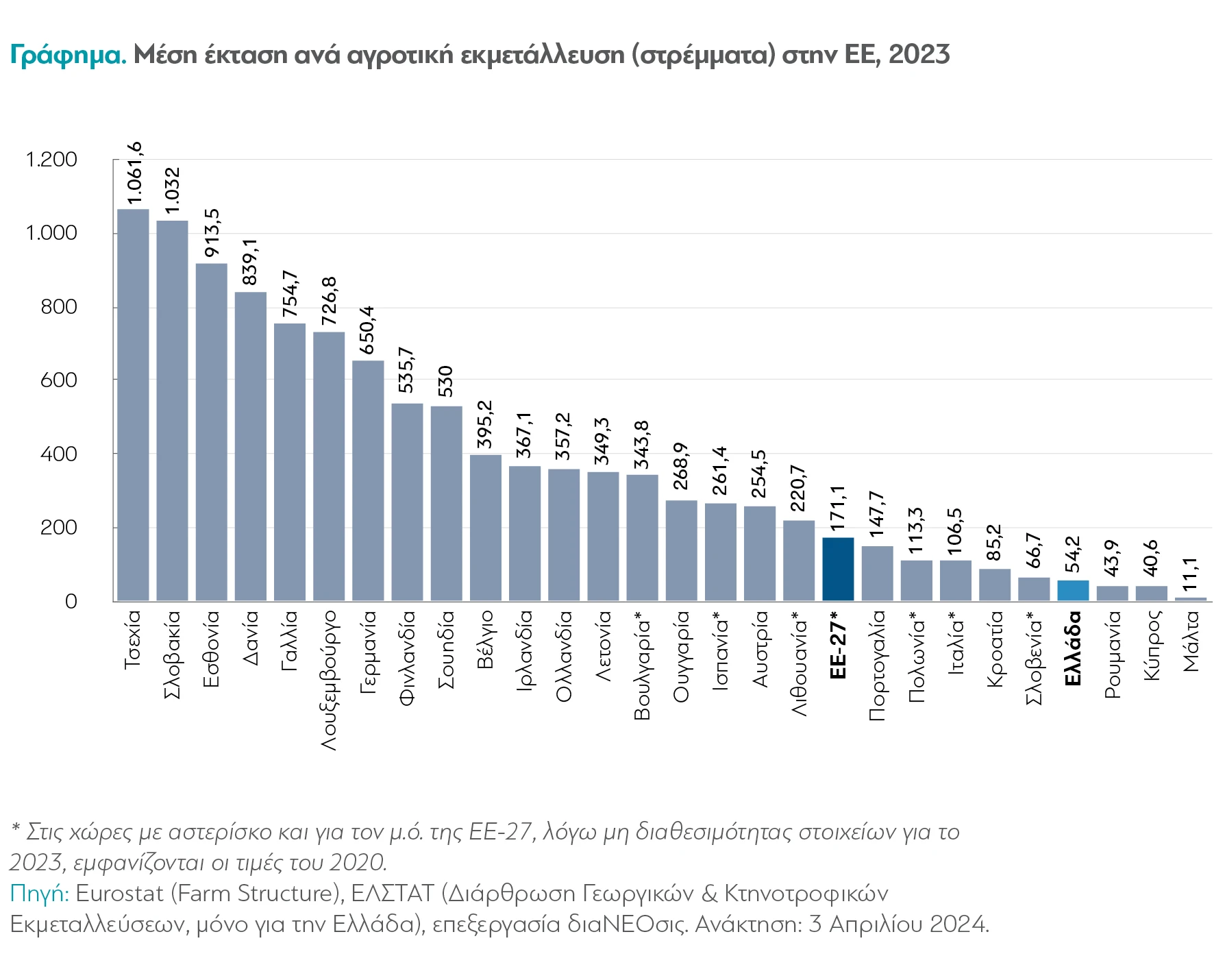 Η αδυναμία αυτή φαίνεται επίσης στον τρόπο με τον οποίο μοιράζεται η συνολική ενεργή αγροτική γη. Στην Ελλάδα, λιγότερο από το 30% της συνολικής χρησιμοποιούμενης αγροτικής γης βρίσκεται σε εκμεταλλεύσεις άνω των 300 στρεμμάτων. Ακόμα πιο χαμηλά, οι μονάδες άνω των 500 στρεμμάτων καλύπτουν μόλις το 16% της γης. Στην ΕΕ των 27, τα αντίστοιχα ποσοστά είναι πολλές φορές υψηλότερα: 77% για τις εκμεταλλεύσεις άνω των 300 στρεμμάτων και 68% για τις εκμεταλλεύσεις άνω των 500 στρεμμάτων.