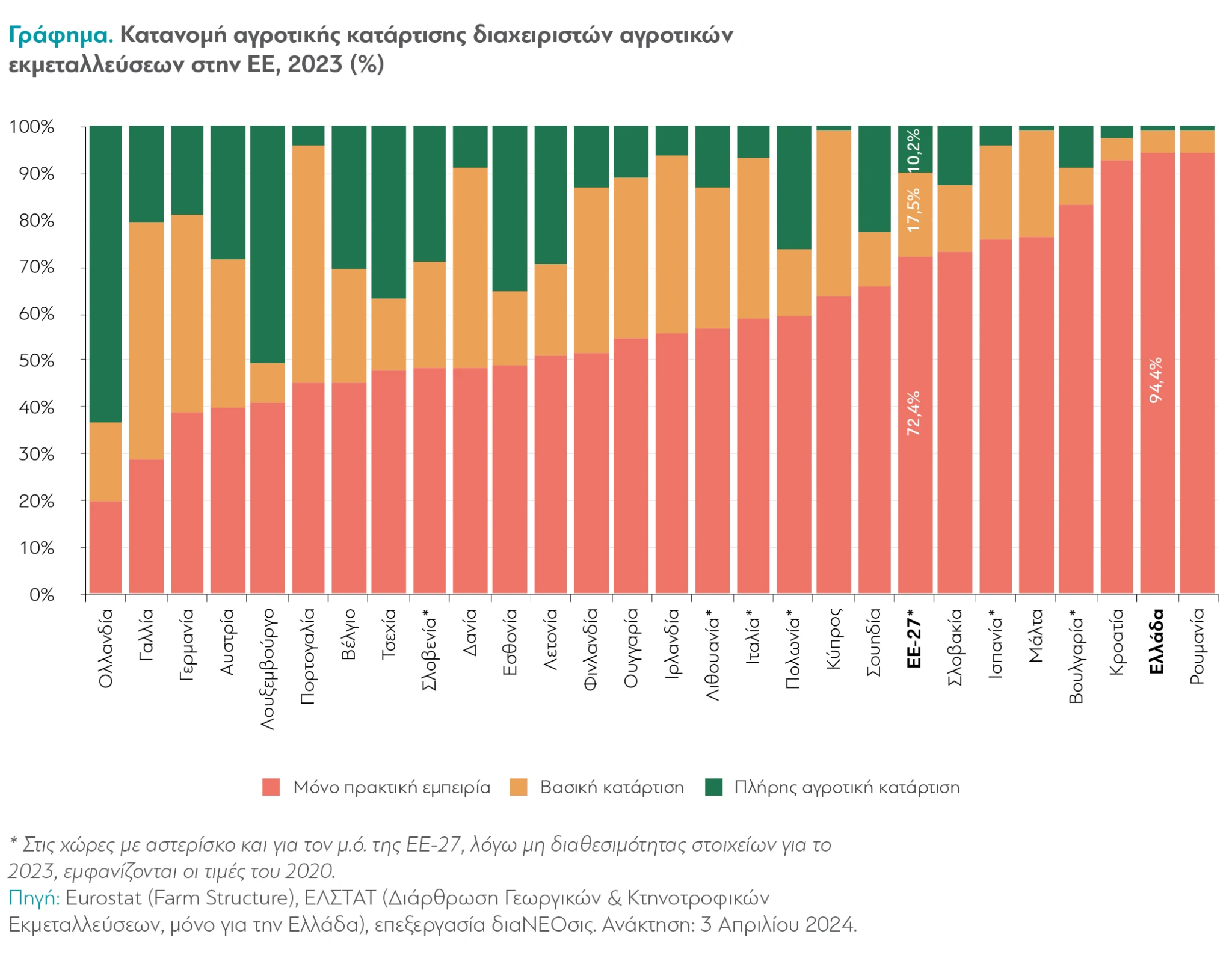 Πολλοί δείκτες μαρτυρούν ότι οι Έλληνες αγρότες είναι από τους λιγότερο εκπαιδευμένους στην ΕΕ. Σύμφωνα με στοιχεία της ΕΛΣΤΑΤ, το 2023 μόλις το 0,7% των διαχειριστών αγροτικής γης είχε πλήρη αγροτική κατάρτιση. Ένα ακόμη 4,9% είχε κάποια βασική κατάρτιση στην αγροτική παραγωγή. Αντίθετα, το 94,4% δεν είχε καμία σχετική εκπαίδευση και στηριζόταν μόνο στην πρακτική εμπειρία. Το πρόβλημα δεν φαίνεται μόνο από τα πρόσωπα, αλλά και από τη γη που αυτά διαχειρίζονται. Οι διαχειριστές με πλήρη αγροτική κατάρτιση διαχειρίζονται μόλις το 1,3% της ενεργής ελληνικής αγροτικής γης. Όσοι διαθέτουν έστω βασική κατάρτιση διαχειρίζονται το 8,9%. Άρα, το 89,8% της χρησιμοποιούμενης έκτασης μένει στα χέρια διαχειριστών χωρίς καμία εκπαίδευση. Η σύγκριση με την υπόλοιπη ΕΕ αναδεικνύει περαιτέρω το πρόβλημα. Στην ΕΕ-27, όπως φαίνεται και στο ακόλουθο γράφημα, οι αγρότισσες και οι αγρότες με κάποιου είδους κατάρτιση είναι πολλές φορές περισσότεροι και επιπλέον διαχειρίζονται πολλαπλάσιες εκτάσεις γης.