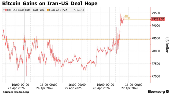 Το Bitcoin συνέχισε τη σταδιακή του άνοδο προς τα 80.000 δολάρια τη Δευτέρα, καθώς οι επενδυτές αξιολογούσαν τις τελευταίες εξελίξεις στην αντιπαράθεση μεταξύ ΗΠΑ και Ιράν σχετικά με το Στενό του Ορμούζ.