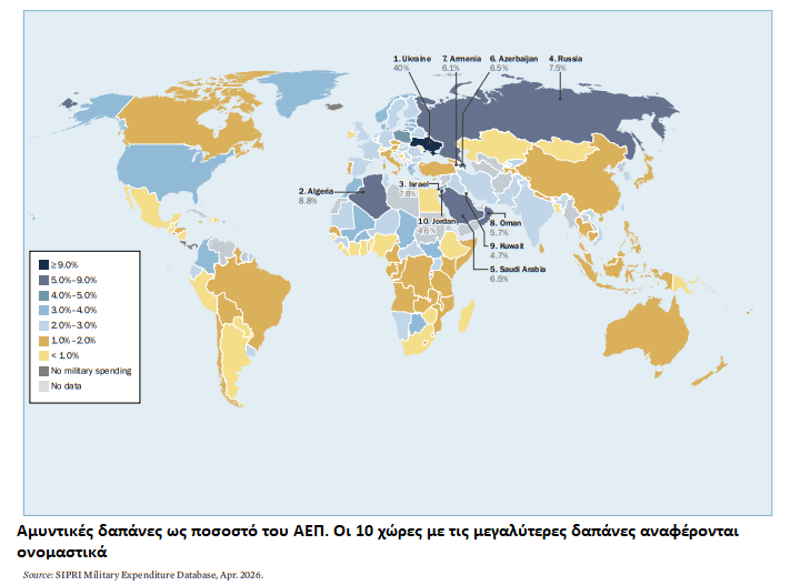 Όπως σημείωσε, η τάση αυτή αποτυπώνεται και στο παγκόσμιο «στρατιωτικό βάρος» — δηλαδή στο ποσοστό του παγκόσμιου ΑΕΠ που κατευθύνεται σε στρατιωτικές δαπάνες — το οποίο έφτασε στο υψηλότερο επίπεδο από το 2009.