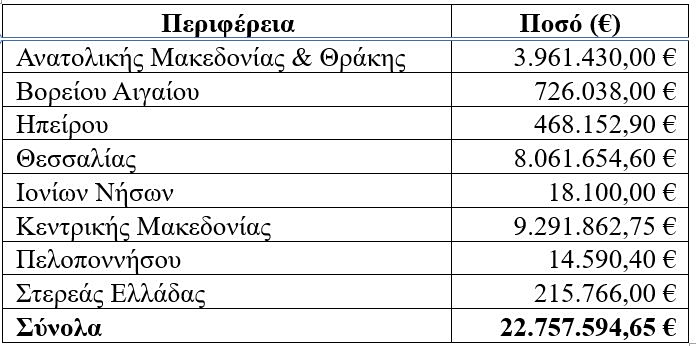 Τα περισσότερα χρήματα καταβλήθηκαν στην Κεντρική Μακεδονία με το ποσό να φτάνει τα 9.291.862,75 ευρώ και ακολουθεί η Θεσσαλία με 8.061.654,60 ευρώ και η Ανατολική Μακεδονία – Θράκη με 3.961.430 ευρώ.