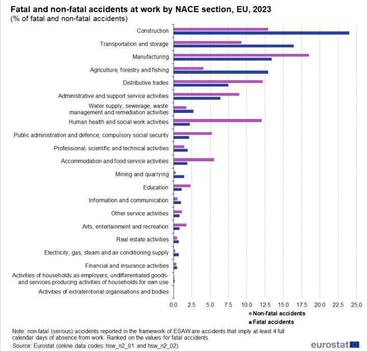 Εντός της ΕΕ, οι τομείς των κατασκευών, των μεταφορών και της αποθήκευσης, της μεταποίησης, καθώς και της γεωργίας, της δασοκομίας και της αλιείας αντιπροσώπευαν συνολικά το 66,8 % του συνόλου των θανατηφόρων εργατικών ατυχημάτων το 2023 και το 44,8 % του συνόλου των μη θανατηφόρων εργατικών ατυχημάτων. Σχεδόν το ένα τέταρτο (24,0 %) του συνόλου των θανατηφόρων εργατικών ατυχημάτων στην ΕΕ σημειώθηκε στον τομέα των κατασκευών, ενώ ο τομέας των μεταφορών και της αποθήκευσης (16,4 %) κατείχε τη δεύτερη υψηλότερη θέση. Η μεταποίηση (13,4 %) και η γεωργία, η δασοκομία και η αλιεία (12,9 %) ήταν οι μόνες άλλες κατηγορίες της NACE για τις οποίες καταγράφηκαν ποσοστά διψήφιου αριθμού στο σύνολο των θανατηφόρων ατυχημάτων.
