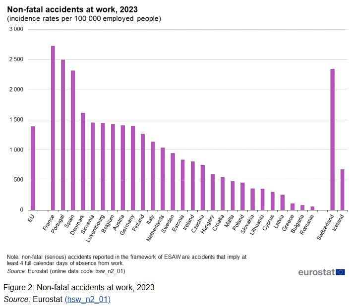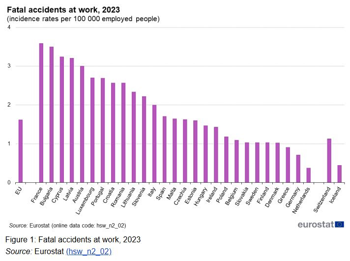 Το υψηλότερο ποσοστό συχνότητας μεταξύ των χωρών της ΕΕ καταγράφηκε στη Γαλλία, με 3,60 θανατηφόρα ατυχήματα ανά 100.000 εργαζόμενους. Ωστόσο, η Γαλλία διαθέτει ένα ειδικό σύστημα δήλωσης και αναγνώρισης των εργατικών ατυχημάτων, το οποίο επικεντρώνεται στην αναφορά συμβάντων που σχετίζονται με την εργασία. Το σύστημα αυτό συνήθως δεν κάνει διάκριση μεταξύ των ατυχημάτων των οποίων η κύρια αιτία είναι η εργασία και των ατυχημάτων που συμβαίνουν στον χώρο εργασίας. Οι τελευταίες περιπτώσεις θα πρέπει να εξαιρούνται μόνο εάν αποκλειστούν άλλα αιτιώδη στοιχεία που σχετίζονται με την εργασία. Αυτό ενδέχεται να οδηγήσει σε υψηλότερο αριθμό αναφερόμενων εργατικών ατυχημάτων στη Γαλλία σε σύγκριση με άλλες χώρες, συμπεριλαμβανομένων εκείνων με παρόμοια συστήματα γνωστοποίησης ατυχημάτων. Τα κύρια χαρακτηριστικά που διαφοροποιούν το γαλλικό σύστημα από άλλα συστήματα παρατίθενται στο παράρτημα που επισυνάπτεται στα μεταδεδομένα της ESAW.