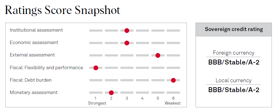 Αντίθετα, ενδεχόμενη βελτίωση των εξωτερικών ανισορροπιών με διατηρήσιμο τρόπο, για παράδειγμα μέσω μείωσης της εξάρτησης της οικονομίας από εισαγωγές, θα μπορούσε να οδηγήσει σε αναβάθμιση. Αναβάθμιση θα μπορούσε επίσης να προκύψει σε περίπτωση ουσιαστικής μείωσης του εξωτερικού χρέους της χώρας, μεγάλο μέρος του οποίου είναι δημόσιο.