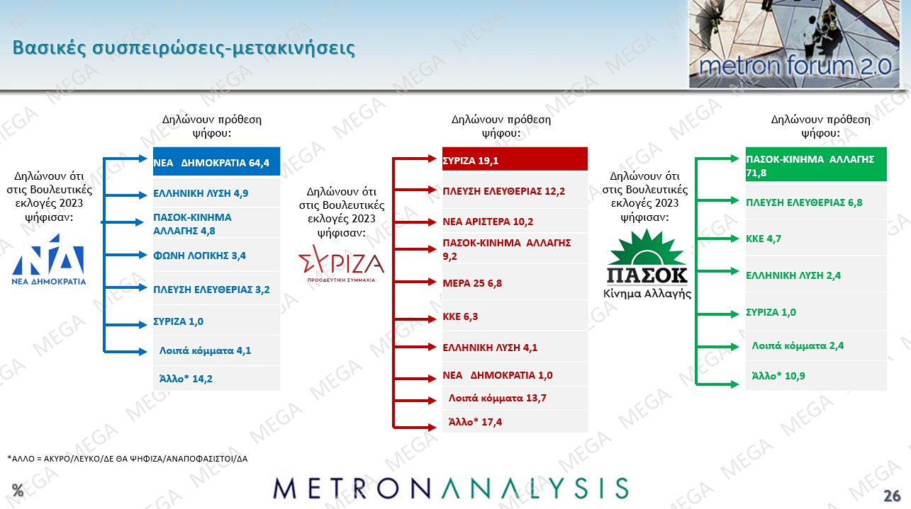 Η Νέα Δημοκρατία εμφανίζει συσπείρωση στο 64,4% και απώλειες προς την Ελληνική Λύση, το ΠΑΣΟΚ, τη Φωνή Λογικής και την Πλεύση Ελευθερίας. Το ΠΑΣΟΚ, έχει διαρροές προς την Πλεύση Ελευθερίας, το ΚΚΕ και την Ελληνική Λύση, ενώ ο ΣΥΡΙΖΑ έχει μεγάλες απώλειες προς την Πλεύση Ελευθερίας, τη Νέα Αριστερά, το ΠΑΣΟΚ, το ΜέΡΑ25, και το ΚΚΕ.
