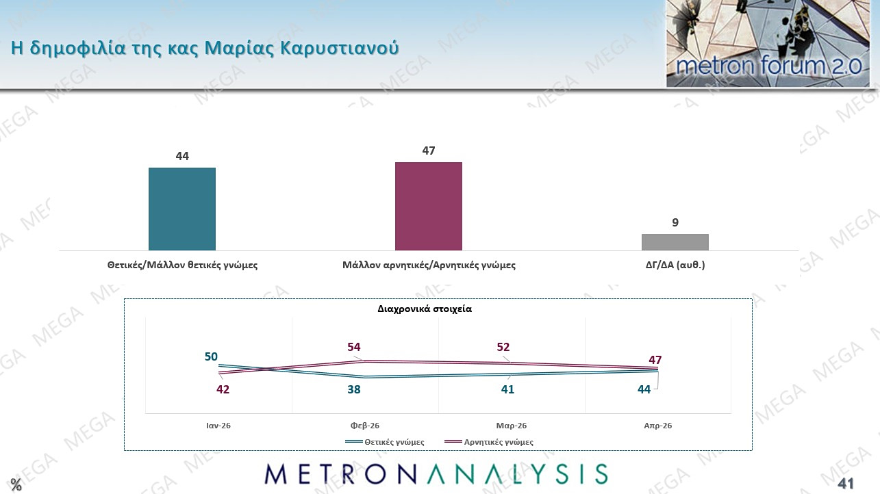 Την ίδια στιγμή η δημοσκόπηση της Metron Analysis, δείχνει ότι παραμένει υψηλή η δημοφιλία της Μαρίας Καρυστιανού, με την απήχησή της να είναι μεγάλη των Κεντροαριστερών, Κεντρώων και Αριστερών ψηφοφόρων, αλλά και μεταξύ των Δεξιών.