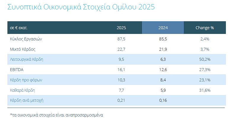 Το EBITDA αυξήθηκε κατά +27,3 %, στα €16,1 εκατ. με αύξηση του περιθωρίου στο 18,4% σε σχέση με 14,8% το 2024.
