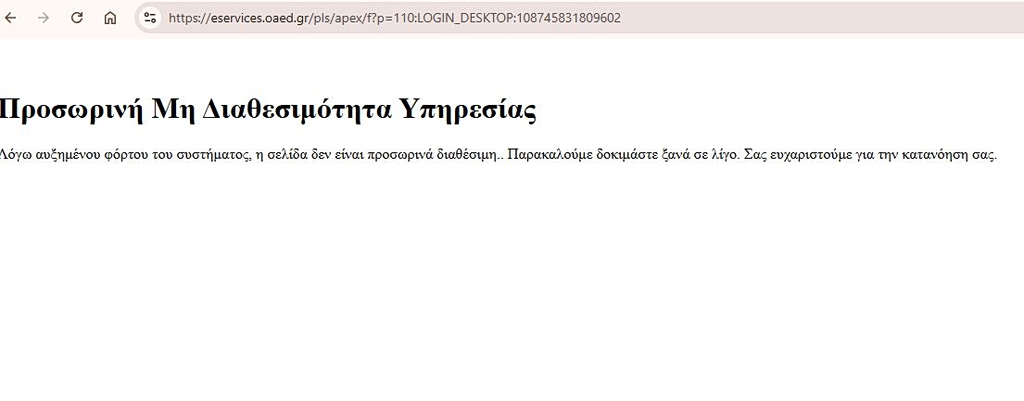 Kαι σήμερα Τετάρτη, όσοι προσπαθούν να μπουν στην πλατφόρμα βλέπουν τέτοιες εικόνες και μηνύματα όπως “προσωρινή μη διαθεσιμότητα υπηρεσίας” λόγω “αυξημένου φόρτου του συστήματος”.