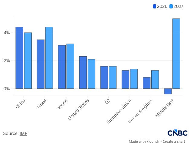 Το ΔΝΤ εκτιμά ότι η οικονομία του Ισραήλ θα αναπτυχθεί κατά 3,5% φέτος, σε σύγκριση με 2,3% για τις Ηνωμένες Πολιτείες και 1,3% για την ΕΕ. Αυτό σημαίνει επίσης ότι το ΑΕΠ του Ισραήλ προβλέπεται να ξεπεράσει όλες τις χώρες του G7 το 2026. Το επόμενο έτος, το ΔΝΤ προβλέπει ότι το Ισραήλ θα σημειώσει οικονομική ανάπτυξη 4,4%, συνεχίζοντας να ξεπερνά πολλές μεγάλες ανεπτυγμένες οικονομίες.