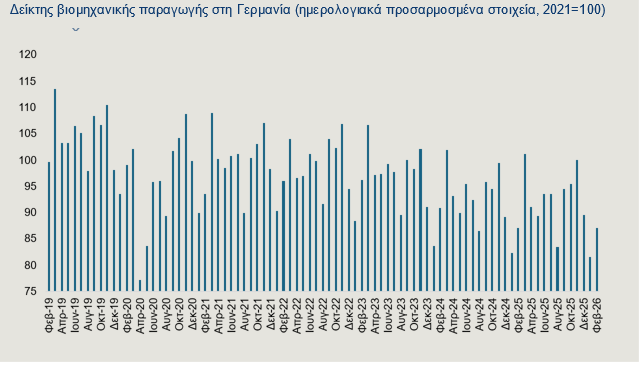 Όσον αφορά την κλαδική διάσταση, ο δείκτης βιομηχανικής παραγωγής ακολουθεί πτωτική τάση από τις αρχές του περασμένου έτους περίπου. Τον Μάρτιο 2025 είχε φθάσει στο επίπεδο του 101,2 και μέχρι τον Φεβρουάριο 2026 υποχώρησε στο 87.
